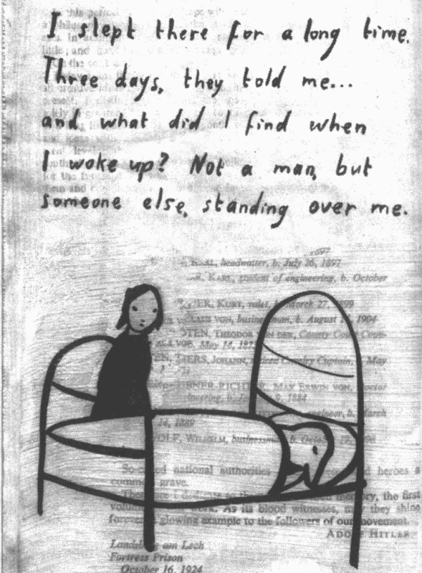 За эту неделю Макс навырезал страниц из «Майн кампфа» и закрасил их белым. После чего развесил их на прищепках на веревке, протянутой из одного угла подвала в другой. Когда краска высохла, началось самое трудное. У Макса имелось какое-никакое образование, но он уж точно не был ни писателем, ни художником. Несмотря на это, он тасовал слова в голове, пока не сумел изложить все без запинки. И только тогда, на бумаге, вскоробившейся и закрутившейся под давлением высохшей краски, начал он записывать историю. Маленькой кистью, черной краской.